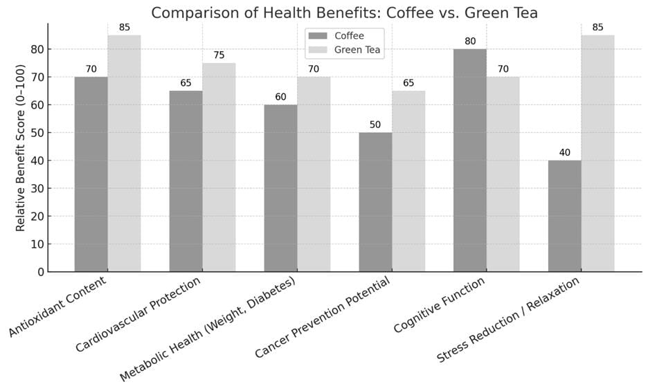 Both coffee and green tea offer significant health benefits, but their strengths differ: coffee is superior for cognitive stimulation, while green tea is richer in antioxidants and offers broader preventive effects on cancer, metabolic and cardiovascular health. Choosing one or both depends on individual health goals and tolerance to caffeine.